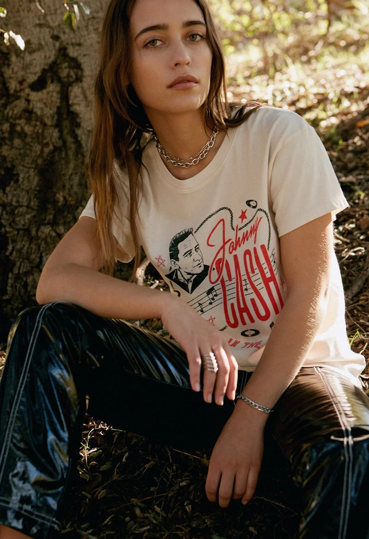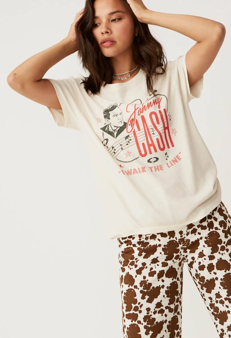 Oh, this classic? Yeah, it only took Johnny Cash twenty minutes to write it. Sixty-four years after its release, Walk The Line is still on everyone’s lips—it’s basically the song that defined the sound for the Man In Black! Intended to serve as a reminder to stay faithful to his then-wife Vivian, it’s easily one of the most recognized crossover songs in music history. Featuring a retro, 50s inspired graphic on an aged-white tour tee, this iconic hit should take you less time to ‘add to cart’ than it did for the legend to pen the lyrics. Your twenty minutes starts … now.
