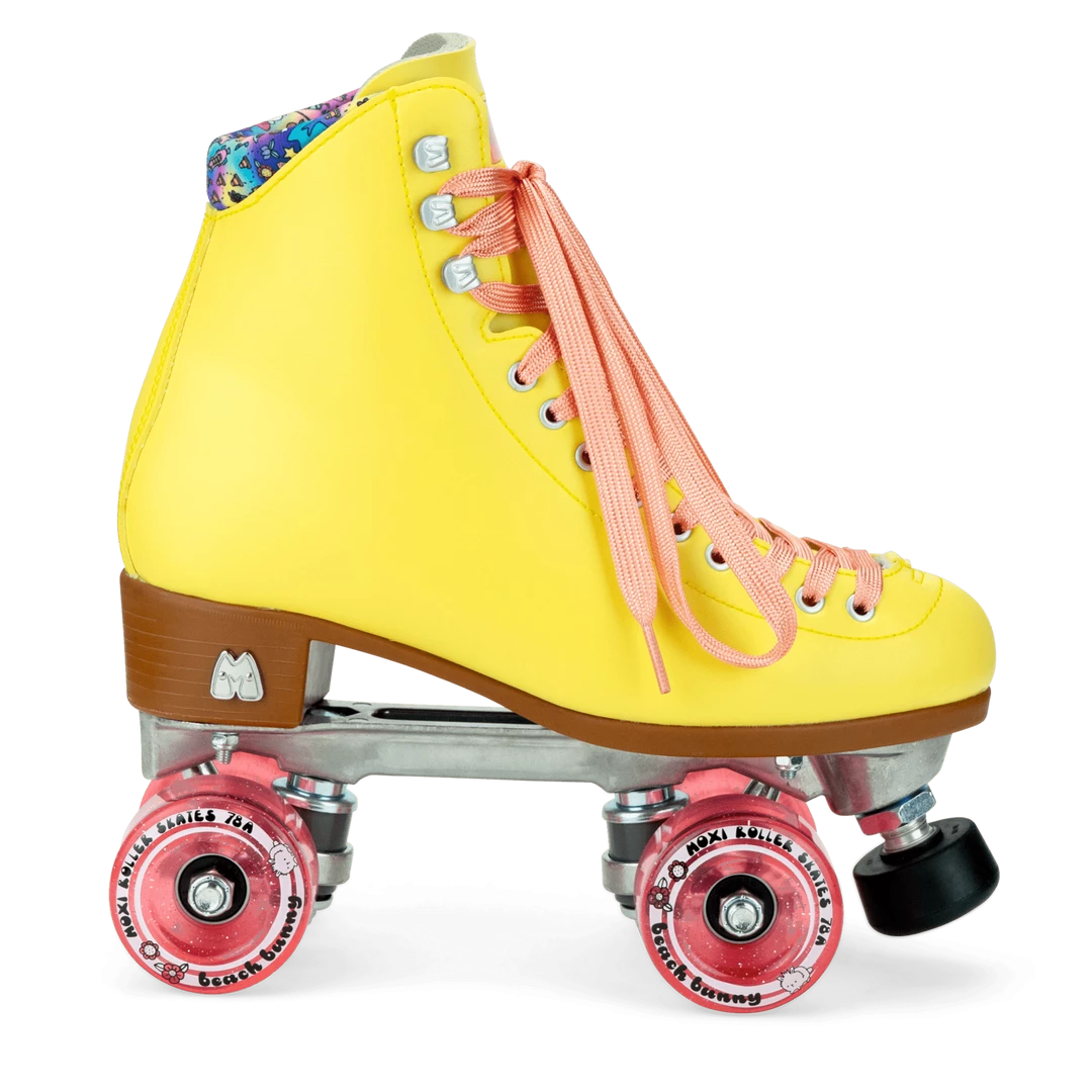 With the Beach Bunny line, classic Moxi fashion has never been more affordable! The Beach Bunny features a traditional high top boot with thoughtful touches including drum-dyed vinyl uppers for more authentic color saturation and additional ankle padding that provides comfort and security whether you’re cruising down the boulevard or ripping up your favorite skate park. Bright laces that shine in the sun add to the fashion-forward design of the Beach Bunny, and the moisture-wicking Dri-Lex™ liner is printed with a custom pattern that was designed from scratch by Moxi team members for a skate that is 100% Moxi, inside and out. Complete with glittery high rebound urethane outdoor wheels and a pair of matching toe caps, the Beach Bunny is ready to accompany you on your next adventure!