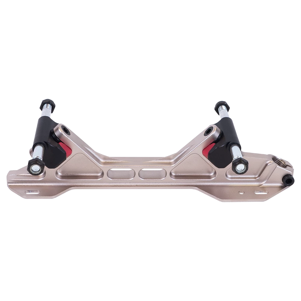 The PowerDyne Arius Platinum takes the roller skate plate to the next level. The Arius Platinum features the same revolutionary design as the original Arius with upgrades in key areas that improve performance and ease-of-use. To start, the toe stop bolt is now found at the very front of the Arius Platinum, instead of behind the toe stop. This provides greater clamping power for secure stops, starts and other toe stop maneuvers. The trucks of the Arius Platinum also receive a significant update, with a “winged” truck body that securely holds the Split Butterfly Cushions in place with no need for any other stabilization or adjustment hardware. Finished in a brilliant platinum gold color, the Arius Platinum is lighter, stronger, more stable, more powerful, more maneuverable, more durable and more efficient than any other plate available today. Each Arius Platinum set comes with 4 sets of Split Butterfly Cushions so you can tailor your ride for your exact needs.