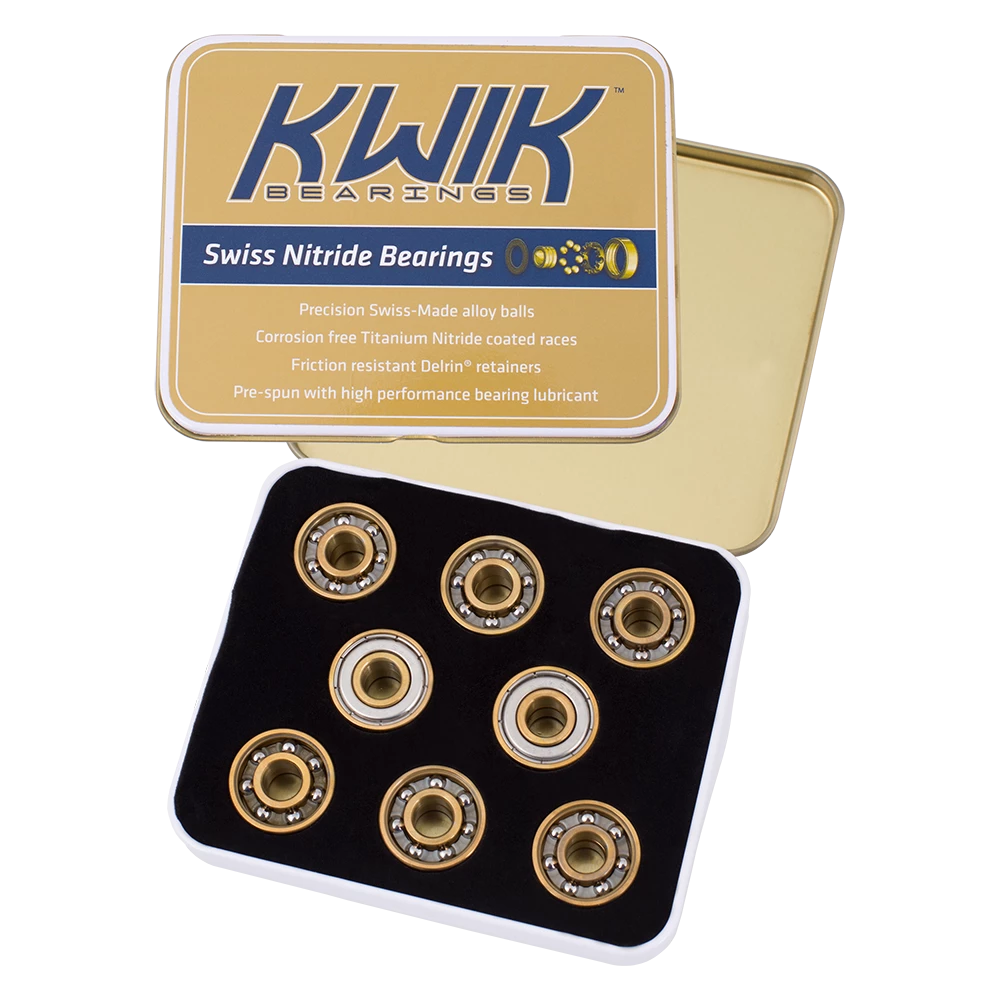 Utilizing precision Swiss-made hardened chromium steel alloy balls and lightweight friction-resistant Delrin®retainers, the races of the KwiK® Swiss Nitride bearings – the surface where friction is created with alloy balls – are coated with a thin coating of Titanium Nitride, a durable chemical-resistant compound that will not chip, dissolve, or otherwise degrade even during the most extreme skating conditions. The Titanium Nitride coating finishes the races of the KwiK Swiss Nitride bearings in a beautiful metallic gold appearance and also strengthens them to produce the fastest, longest roll available today.
