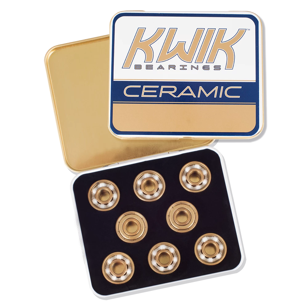 Accelerate faster and roll farther with KwiK® Ceramic bearings. These bearings utilize the advanced characteristics of ceramic balls and combine it with a ceramic Titanium Nitride coating on both sides of the bearing shield and the inner and outer bearing races to create remarkable performance. Aside from the striking metallic gold finish it imparts on the surfaces it covers, Titanium Nitride is a corrosion-resistant material that hardens and strengthens the surfaces it is applied to – improving the lifetime durability of the surface by a factor of 4 or more and further increasing maximum roll. KwiK Ceramic bearings, quite simply, are the most advanced ceramic bearings available.