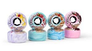 With these wheels, everyday is FUNDAE! A smooth blend of urethane that rolls from street to park. Fundae wheels are 57 mm in diameter and 34mm wide and come in the following cream swirl colors: Lavender, Bubble Gum (pink), Birthday Cake (blue) and Creme de Menthe (teal green). Recommended for slick park surfaces and those new to ramps AND streets and outdoors for those experienced in the streets and want more speed!