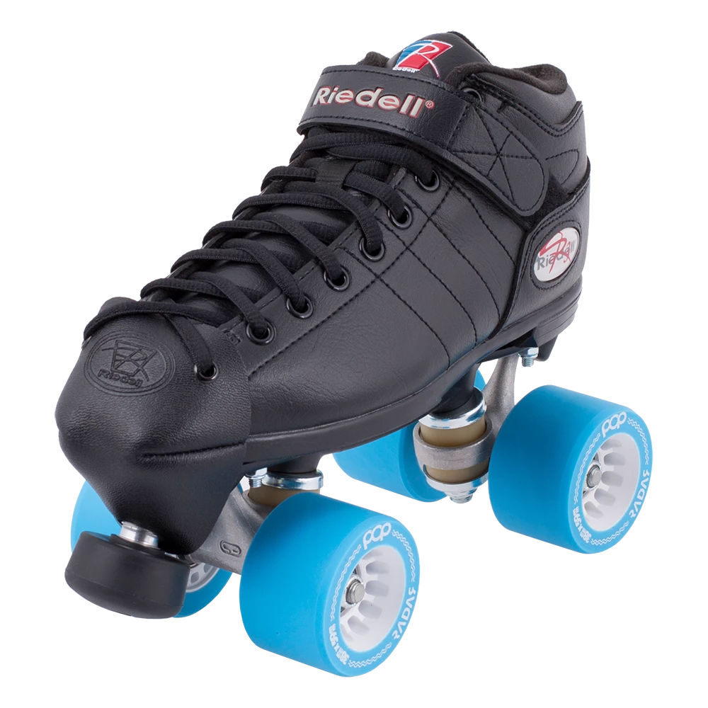 Riedell took the R3 Derby skate and gave it boost with some key added upgrades to bring you the Riedell R3 Derby RS roller skate set. We start with the durable, class-leading R3 boot and add a black tough scuff leather toe cap to prevent abrasion. The boot is attached to a reinforced PowerDyne Thrust nylon plate for a firm base, and the skate is finished off with KwiK Zenith bearings and Radar Halo wheels that provide good grip and speed in all hardnesses and has excellent durability. All of these components combine to make one of the best derby fresh meat starter skate packages on the market.