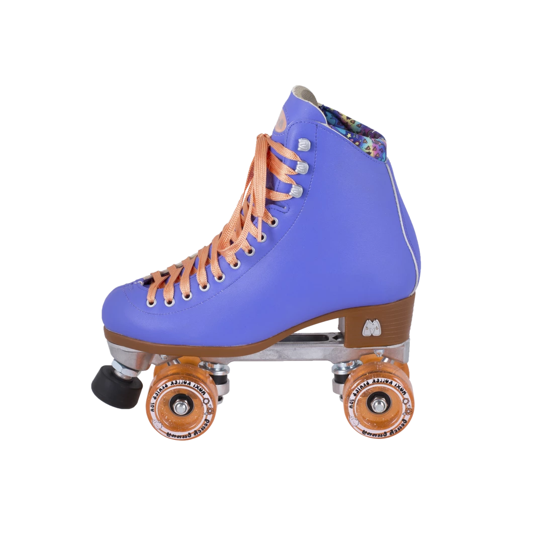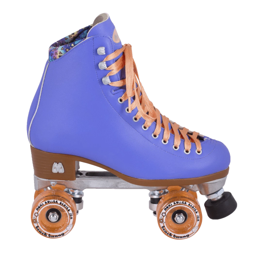 With the Beach Bunny line, classic Moxi fashion has never been more affordable! The Beach Bunny features a traditional high top boot with thoughtful touches including drum-dyed vinyl uppers for more authentic color saturation and additional ankle padding that provides comfort and security whether you’re cruising down the boulevard or ripping up your favorite skate park. Bright laces that shine in the sun add to the fashion-forward design of the Beach Bunny, and the moisture-wicking Dri-Lex™ liner is printed with a custom pattern that was designed from scratch by Moxi team members for a skate that is 100% Moxi, inside and out. Complete with glittery high rebound urethane outdoor wheels and a pair of matching toe caps, the Beach Bunny is ready to accompany you on your next adventure!