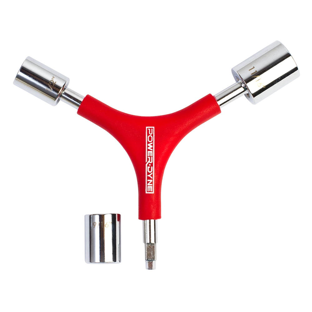 The PowerDyne Y4 Skate Tool features four tools in one! This versatile skate tool includes a 1/2” socket for axle nuts, an 11/16” socket for truck adjustment locknuts on PowerDyne Reactor Series plates, a removable 9/16” socket for truck adjustment locknuts, and finally a 5mm T Handle Allen wrench for toe stop set screws and PowerDyne Arius plate axis pins.