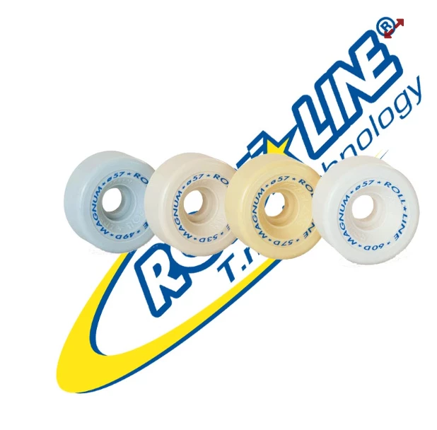The Giotto 49D, 53D, 57D, and 60D Standard FreeStyle Wheels provide a great range of Grip and Roll for the Standard Series of FreeStyle Wheels. The Magnum is less expensive (than the Giotto and Urethane counterparts), yet, very high quality wheel, which is used on many types of skating surfaces including standard wood floors coated with plastic or poly urethane, but also unusual surfaces like, tile type basketball and volleyball courts, tennis courts (Indoor or outdoor), and concrete or terrazzo surfaces that are more common around the World. The Magnum FreeStyle Wheels are used a great deal internationally, where there are few indoor skating centers like there are here in the USA. The Magnum FreeStyle wheels are most often used on abusive surfaces where the life expectancy of the wheels on these tough surfaces are not very long, but very High Skating Quality both Grip and Roll are required. Many of the world level FreeStyle competitors use combinations of hardnesses of the Magnum for Training to achieve the best Skating result. Roll-Line has developed this wheel giving it properties that withstand the extreme and unusual abuse a FreeStyle skater and an abusive Skating Surface can dish out. The Roll-Line Magnum FreeStyle Wheels (49D, 53D, 57D, and 60D) are a Medium-Profile, durable wheel which are Strong, Light, and with extremely Close Tolerances for Roundness, Trueness, and for the Cage where the Bearings and Spacers are mounted. The Roll-Line Magnum FreeStyle Wheels are a MonoCompound Elastomeric ThermoPlastiche wheel, which is produced utilizing an injection system. The 49D, 53D, 57D, and 60D provide a great varying range of grip in the wheel material and is for a skating surfaces with a range of grip. The wheel color identifies which hardness the wheel is.