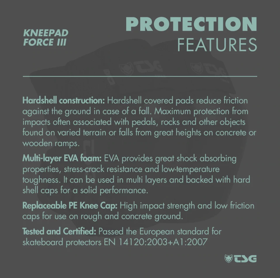 TSG kneepads offer incredible quality surpassing international safety standards such as EN 14120:2003+A1:2007 Level 2 – European standard for skateboard protectors. Designed in Switzerland, TSG products are tested by a passionate internal team of riders and certified by independent lab testing.