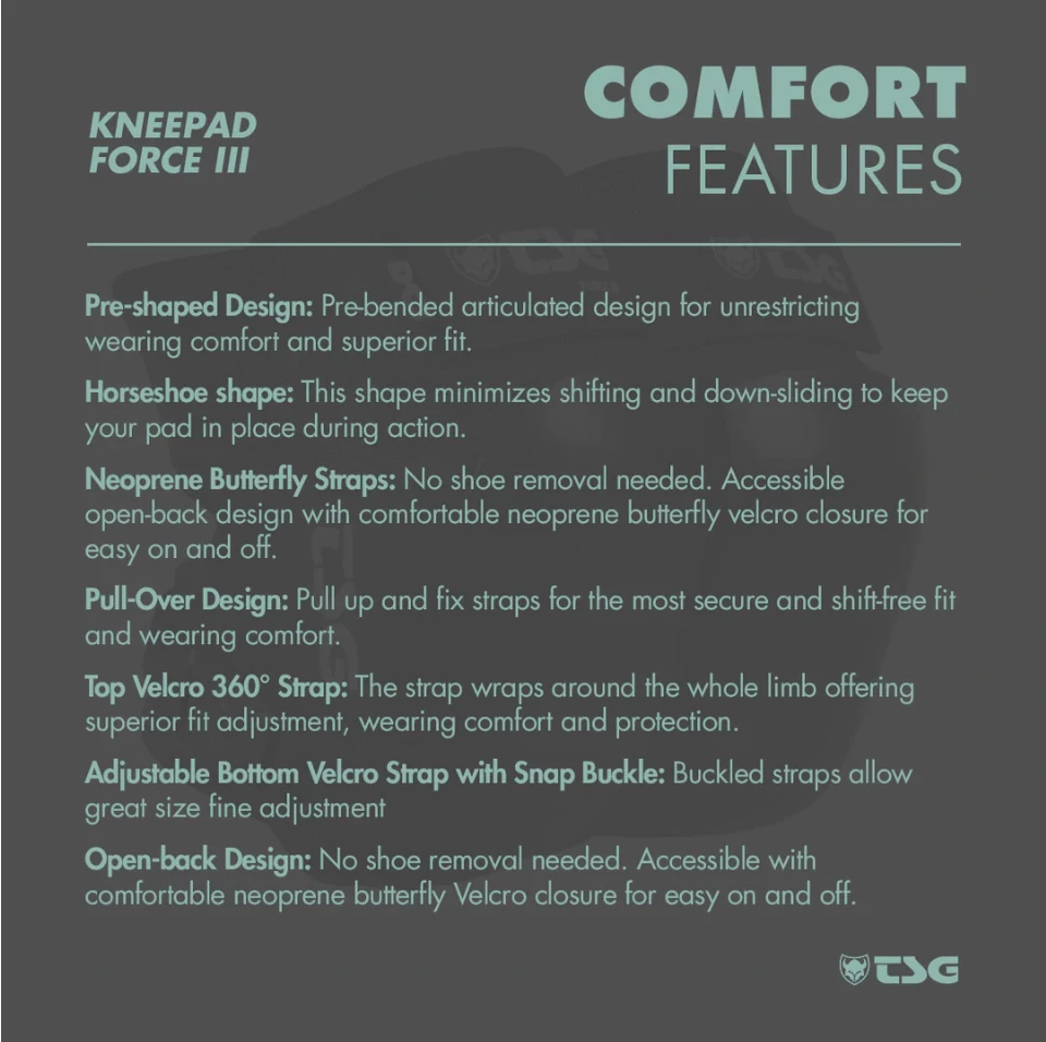 TSG Force III knee pads offer incredible knee protection, perfect for professionals as well as amateurs alike. Skaters can focus on their performance without worrying about the cuts and scrapes on the rink. Skaters will enjoy stress relief from the extra reinforcement at critical pressure points. Comfortable fabric lining adds to all-day wearing comfort.