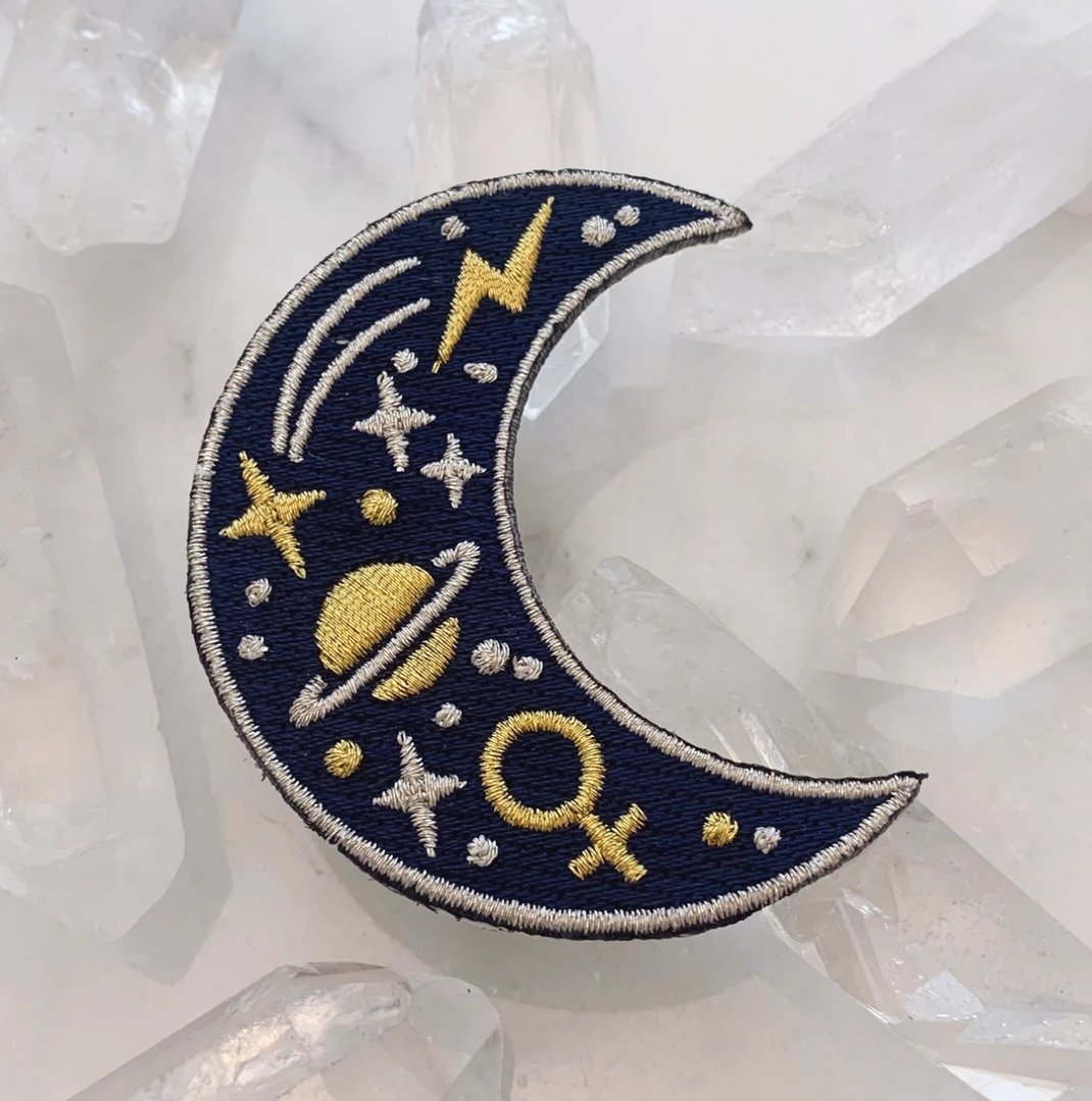 The mysterious magic of the night sky is beautifully embroidered on our crescent moon patch. Twinkling stars, saturn, & a gold venus symbol against midnight navy. Wildflower + Co. patches feature iron-on backings.